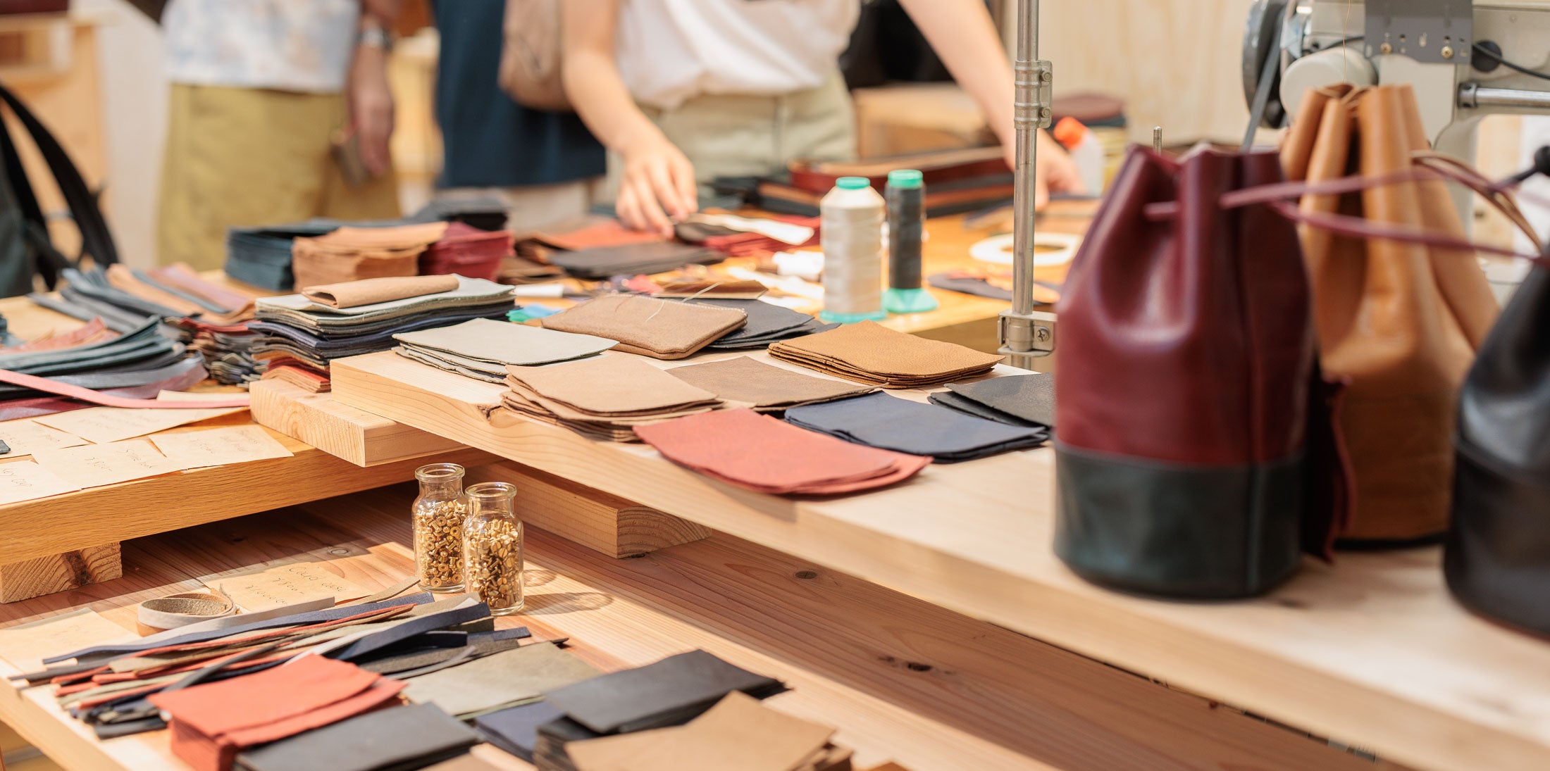今回は緊急企画として革の色、ステッチの色、ファスナー、引手などご自身が選んだカラーをその場で職人がミシンを踏んで仕上げる初の試みを開催。 初めての企画なので不安もありましたが多くのお客様がオリジナルカラーでポーチや巾着バッグをオーダーしてくれて大変好評な3日間でした。 スタッフも一緒に組み合わせパターンをオススメさせてもらいながらお話できて楽しかったです。 普段、製造していても商品化したことのないツートンやマルチカラーが何通りも出来上がるのを見てとても新鮮でした。 仕上がりも満足してもらえて充実した企画となりました。