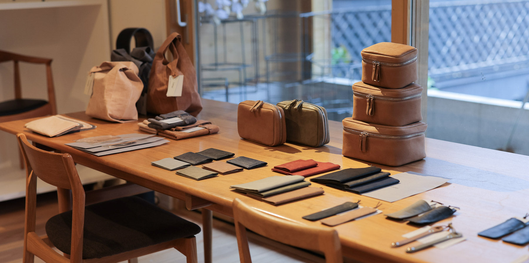 ディナオイルレザーの上品なツヤと個性的な表情がウッドチェアと相性のいい印象です。手前に映るバッグ(DO-12S)は通勤、通学から旅行にもお持ちいただけるトートです。旅のお供にお持ちいただいて、そのまま日常的にお使いの方が多くいらっしゃいます。ポケットを多く配置していて、着替え、PC、雑誌、小物など細かく整理できる内部構造です。上段に映るバッグ(DO-18R)は2wayトートでショルダーベルト付きです。旅行中に大きな荷物を預ければ、貴重品を持って移動しやすいサイズです。内部のベルトを使ってフォルムを変えられます。上から荷物が見えにくいので防犯面でも安心です。