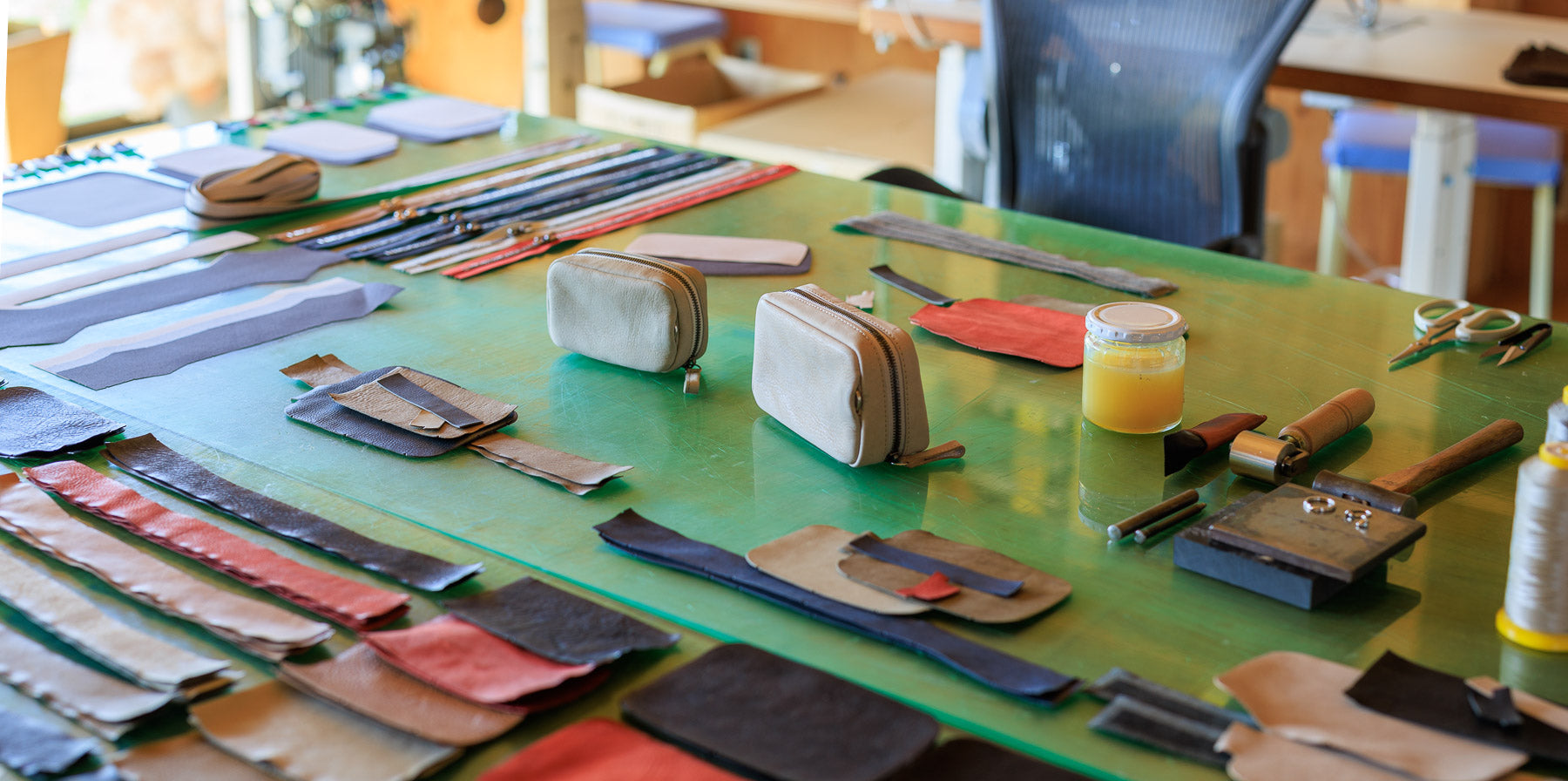 色選びをしていただいた後、「ノリ塗り」・「ヘリ返し」・「ファスナー張り合わせ」・「引っくり返し」まで体験していただきます。それぞれの工程は実際に製品を作るときと同じ作業なので、出来上がりまでの流れや外からでは分からない手仕事の施しをご覧いただけます。そんな工程の中で重要なのが、美しく仕上げるために欠かせない作業である「ヘリ返し」です。職人の手作業の細やかさを最も実感していただけるポイントとなっています。少し難しい作業なのでスタッフがアドバイスやヘルプいたします。縫製・仕上げは製造スタッフが担当いたします!