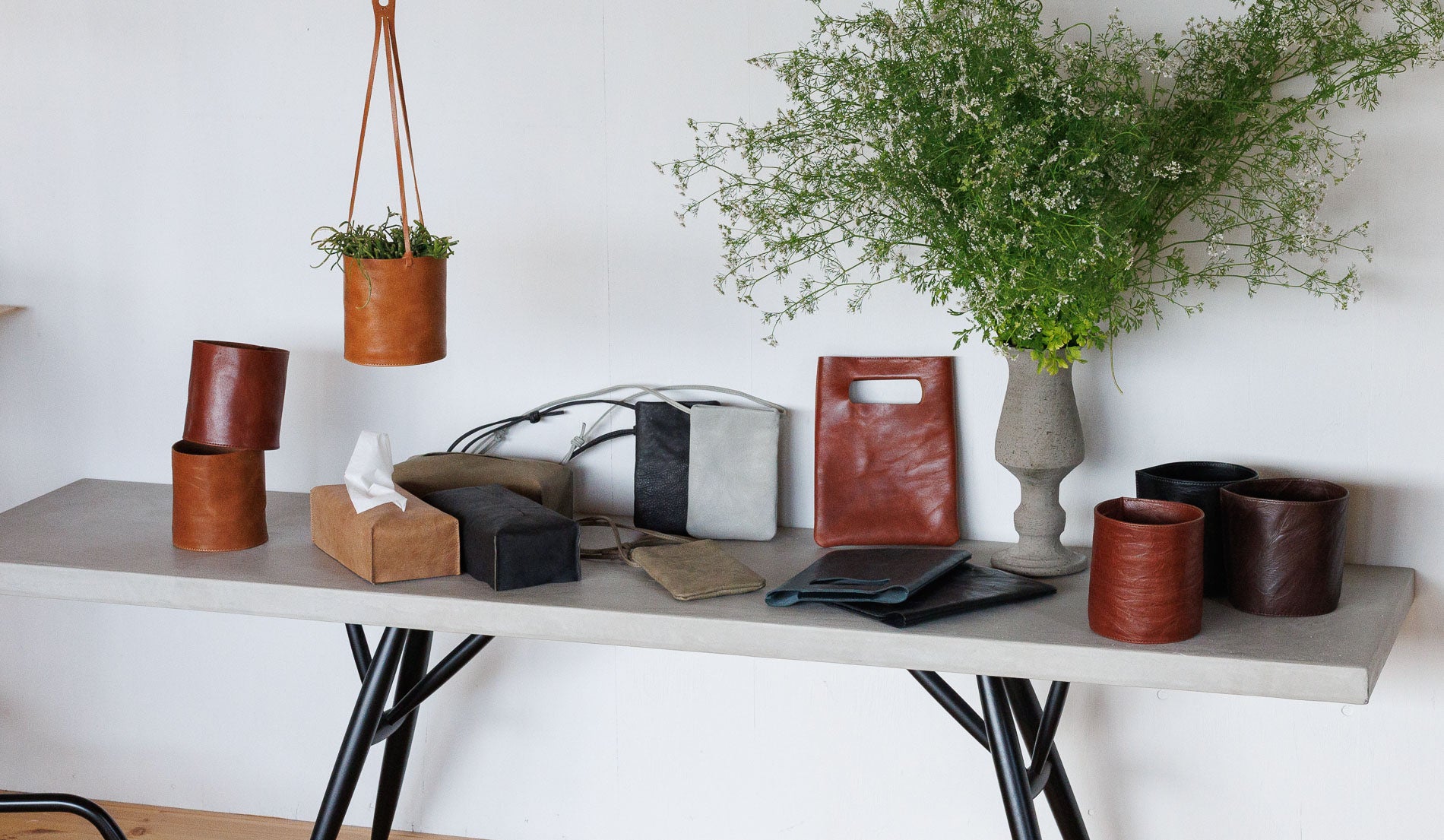 ディナオイル レザーを使用したダストボックス。サイズを小さくして卓上で使えるようにしました。部屋のインテリアにも馴染むシンプルさ、革の表情を生かしたアイテムです。
