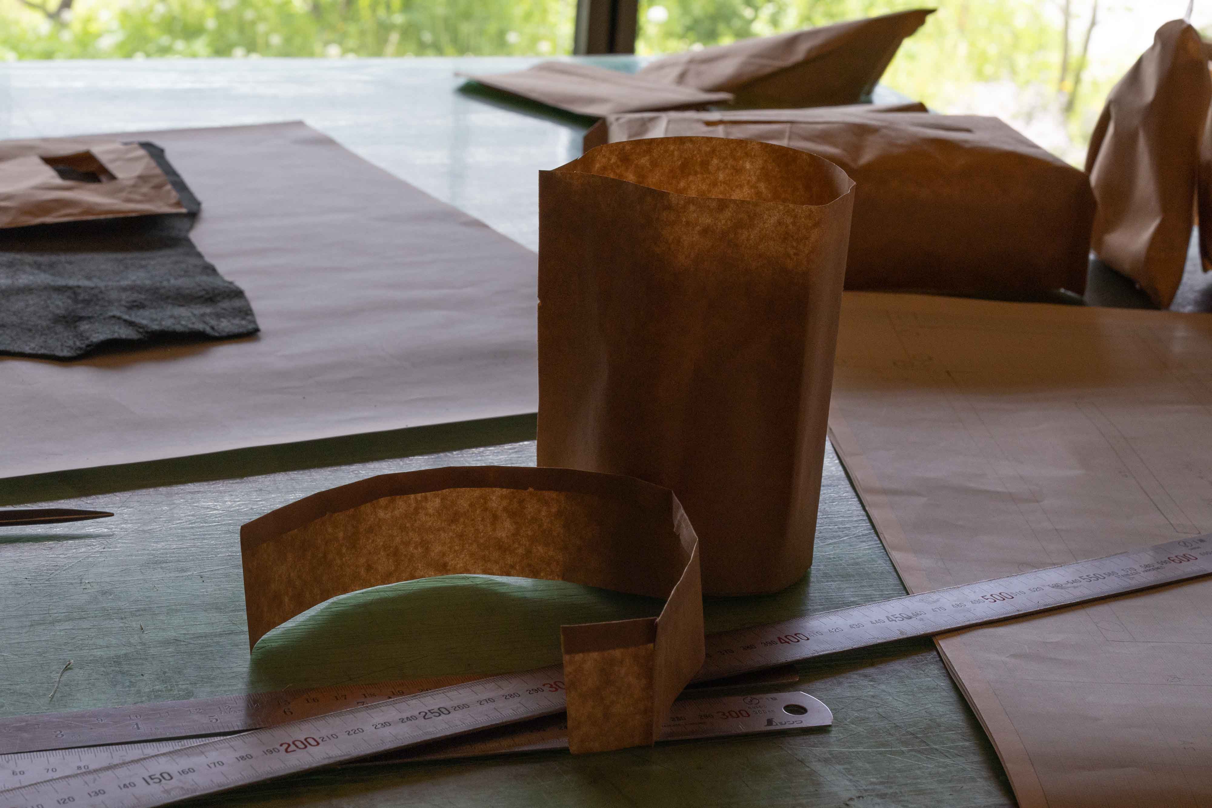 製造スタッフ全員で考案中。 図面に10dsのサイズで生産するものを書き起こしていきます。 考えている商品もみな違うのでさまざまなデザイン案が生まれてます。 想像よりサイズ感が小さく感じるもの、10dsを超えてしまうものなど苦戦しながら案を出していきます。 ここから紙で模型にして実物大のサイズにします。